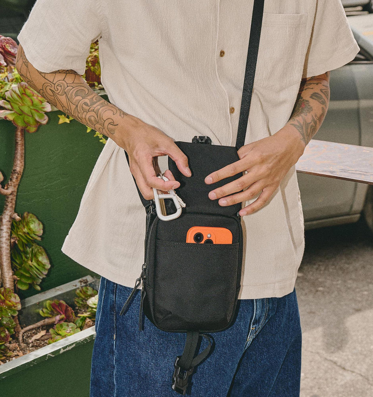 - Adjustable and removable crossbody strap