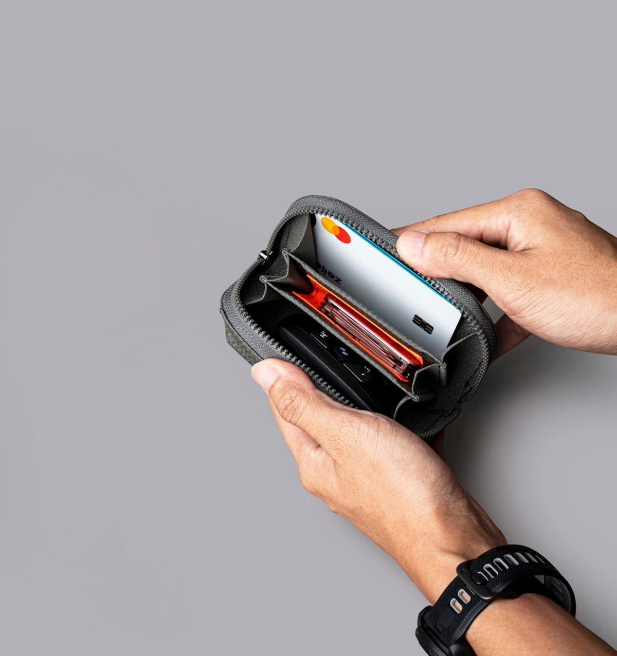 This versatile zip pouch lets you organise cards, cash, keys and other pocket-fillers in whatever way works for you. Then snaps securely to your HUB-compatible bag.