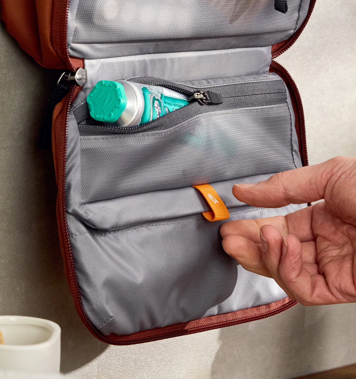 - Slim zip pocket keeps a manual toothbrush hygienically stowed