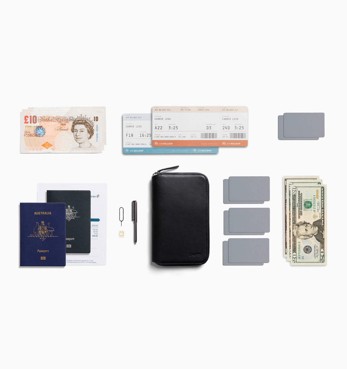 - Left, right and out of sight - Credit cards go left, passport goes right. Then extras – flat bills, receipts, a second passport – tuck behind, to keep things simple.