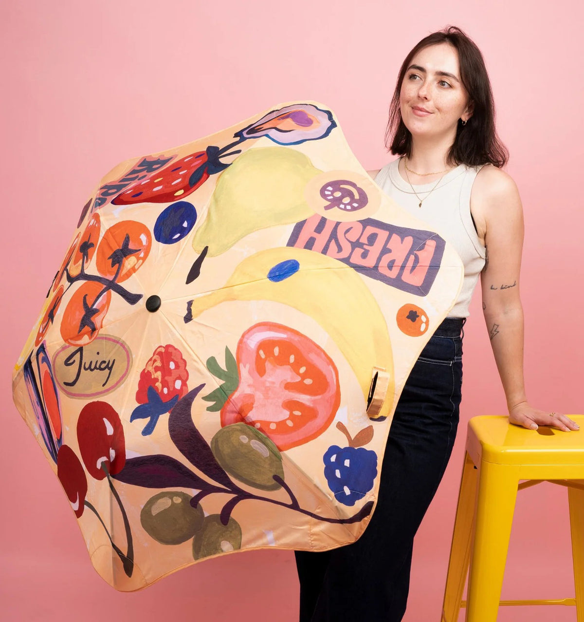 Artist Bonnie Brown, the creative force behind Studio Bon, brings her signature bold colour and playful charm to Blunt's latest limited edition BLUNT Umbrella. It’s a little bit cheeky, think ‘5+ a day’ meets childhood nostalgia, like stealing lemons from a neighbour’s tree or trusting an honesty box on a country road.