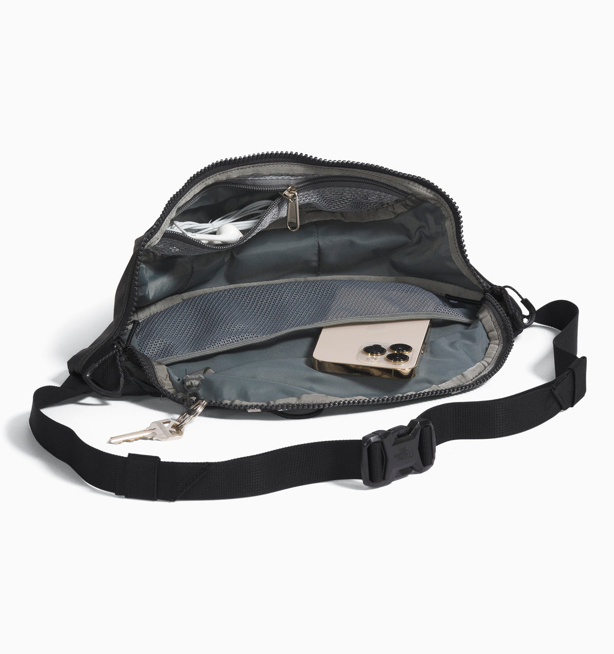 • Main compartment holds larger items such as a water bottle, phone, keys and wallet